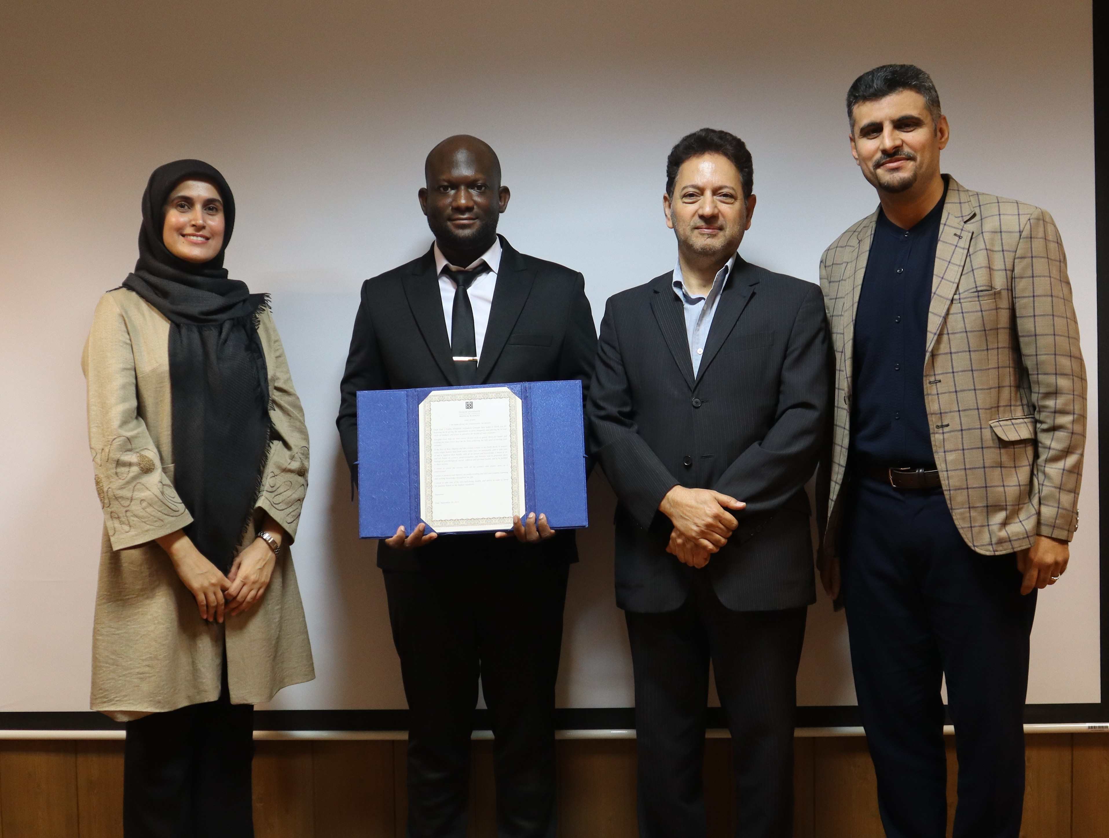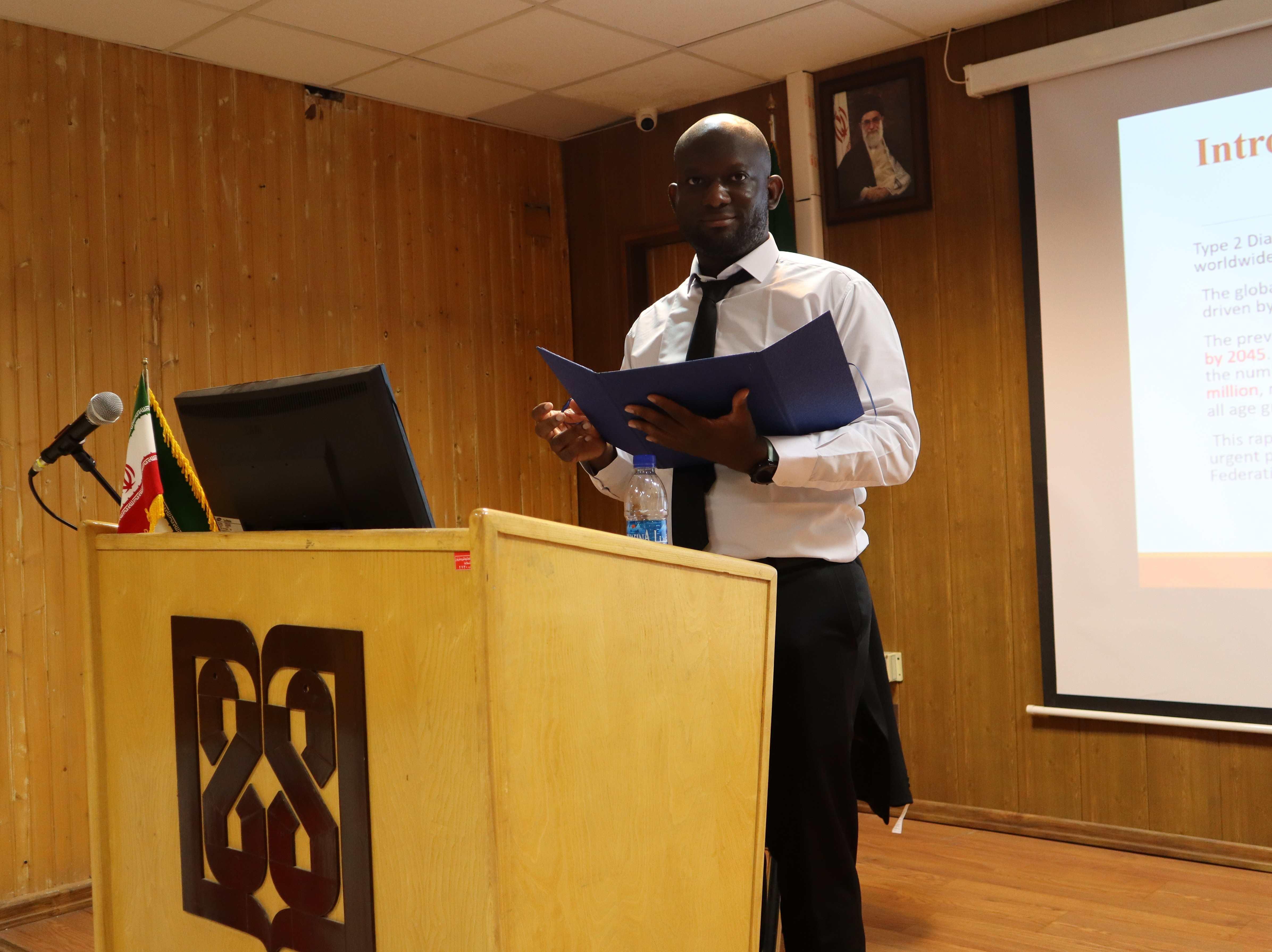 The thesis defense ceremony of the student Fatihu-Abulfatihi Salaudeen Giwa, entitled `Evaluation of the Clinical Outcomes of Individualized Management of Type 2 Diabetes in Selected Clinics in Tehran`, was held on Saturday, September 20th,2025, at the School of Pharmacy, International Campus, in the presence of the supervisors, Dr. Majid Davari, Dr. Soha Namazi, and the esteemed examination committee.